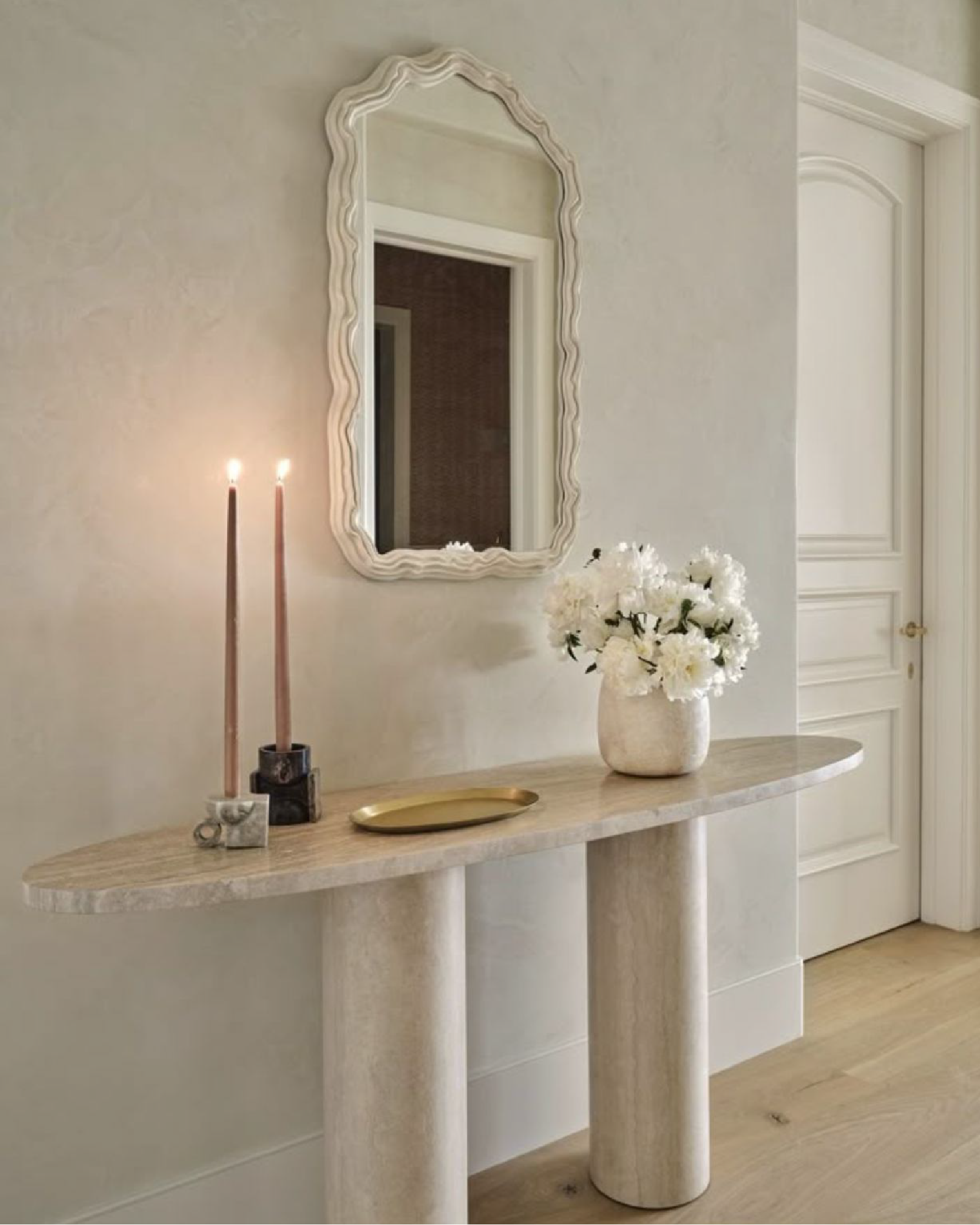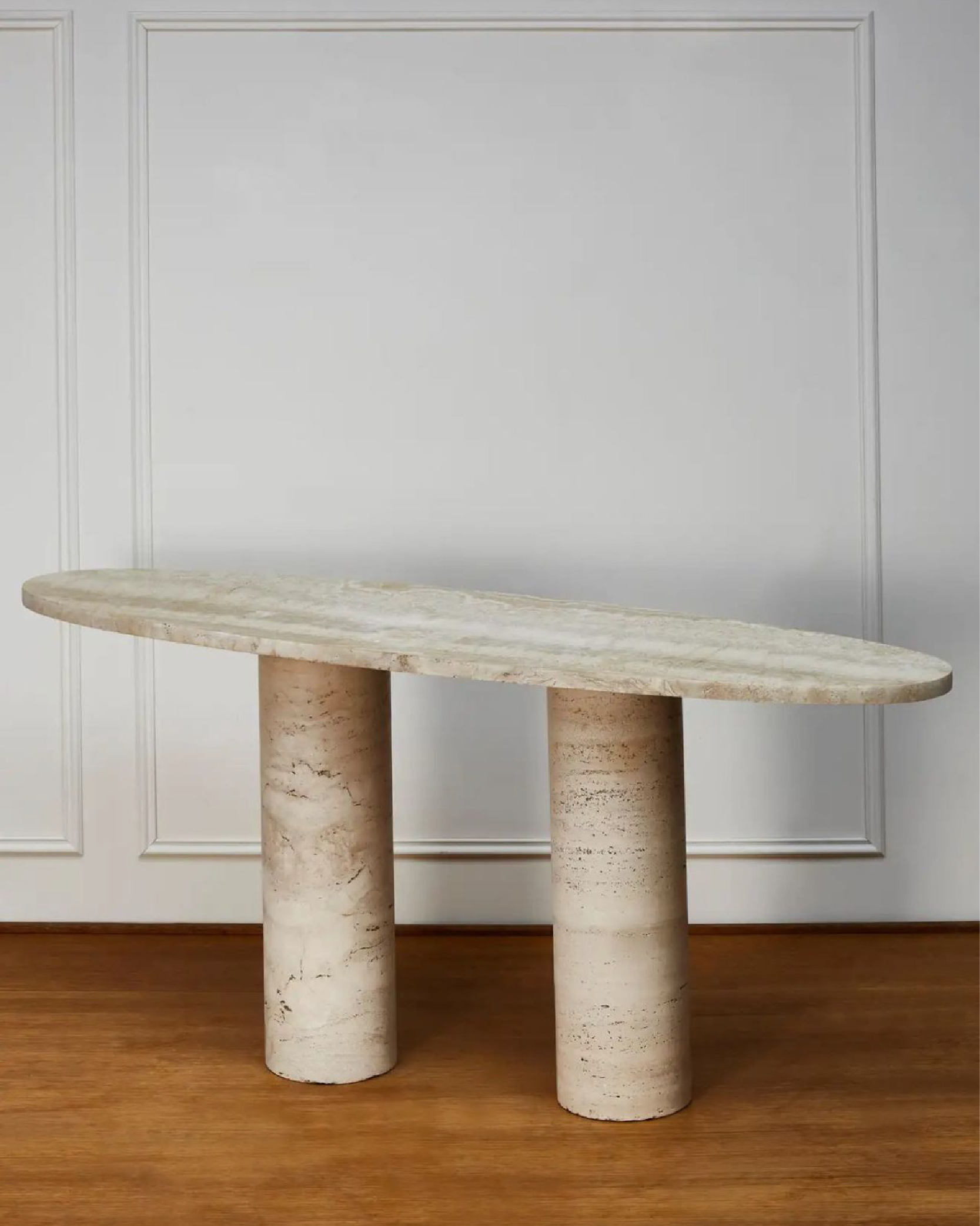 Élancée et subtile, la console Nola allie la douceur d’un plateau ovale en travertin à l’équilibre parfait de ses pieds cylindriques. Son design pur et sa teinte naturelle en font un choix idéal pour une entrée raffinée ou un couloir lumineux. Un hommage à la simplicité élégante et aux lignes épurées.